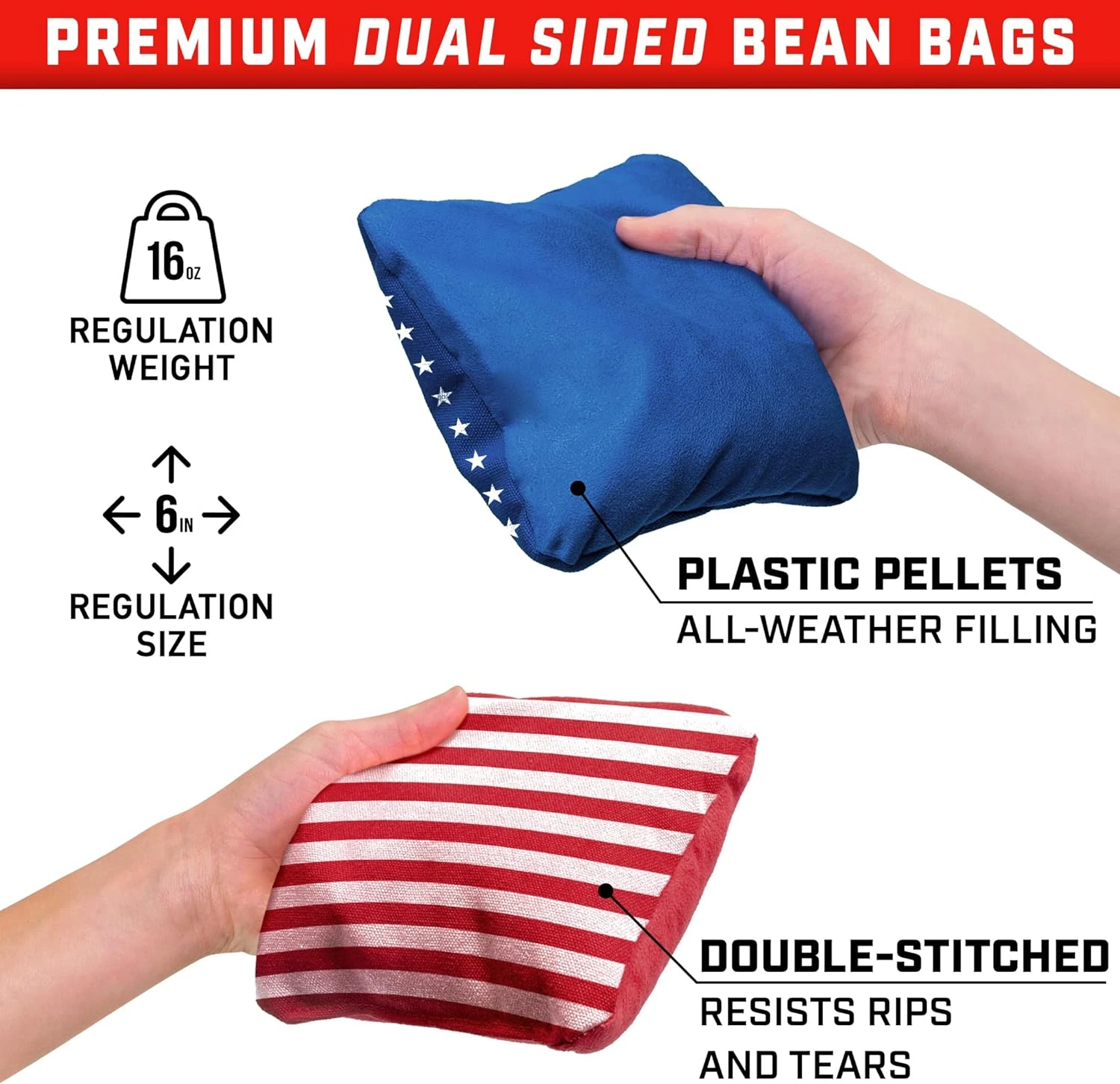 - REGULATION SIZE AND WEIGHT: Professional cornhole bags 6 inch x 6 inch; 16 ounce each