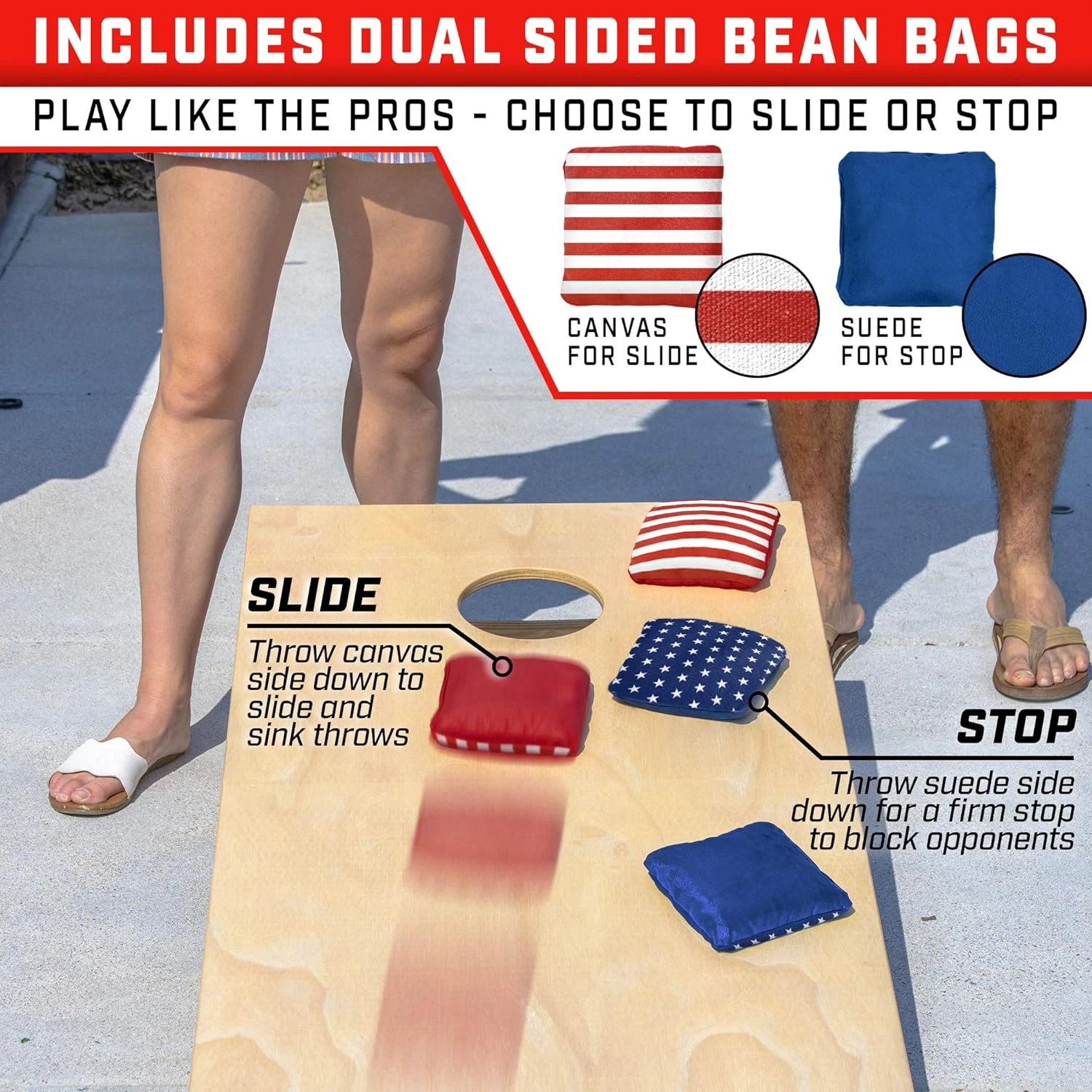 - SLIDE & STOP BEAN BAGS: Includes 8 heavy-duty dual sided bean bags – canvas side (for sliding) and suede-like side (for stopping) to achieve complete control over every throw