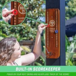 - SCORE TRACKERS INCLUDED: game board features built-in score trackers so players can easily keep track of the score and focus on the next swing