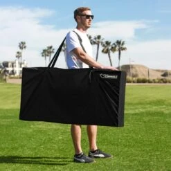 The GoSports Light Brown Stain Cornhole set is a must have for anyone who wants a timeless and stylish set at their next family gathering, BBQ, tailgate party, camping trip, beach day and more! The boards are professionally stained with a dark brown finish and ready for play right out of the box. The 100% solid wooden construction means the integrity of the boards is our top priority, so you won’t find any cheap composite or plastics here. The 4’x2′ full size boards are made to regulation size for cornhole purists and newcomers alike to experience the most authentic game play. The top surface is also 1/2″ varnished cabinet-grade plywood that provides the perfect amount of slide. The frames are handcrafted from solid pine, featuring mitered corner joints which are far superior to the shoddy construction of the ‘homemade style’ sets that simply have 2x4s sloppily nailed together. The wooden legs are retractable and are held in place by robust 3/8″ galvanized steel bolts with wing nuts. One of the greatest features of the GoSports set is we were able to engineer the weight of each set down to a manageable 38 pounds for the 4′ x 2′ boards without sacrificing gameplay so you can get out and play! BEAN BAGS SOLD SEPARATELY.