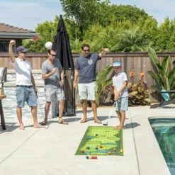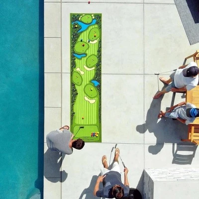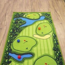 - PREMIUM WOVEN RUG: Rug rolls like a real putting green and features a vibrant golf course design with bunkers, hazards and 6 target greens – easily roll out for setup and roll up for compact storage
