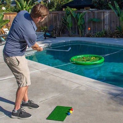 - Set includes inflatable Splash Chip target, 16 foam golf balls, 1 golf chipping mat and 2 tethering ropes for fun games