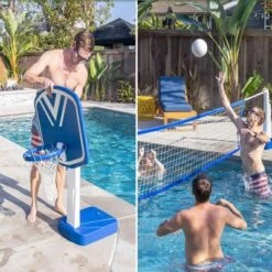 - 2 GAMES IN 1: Instantly switch between full court pool basketball and pool volleyball in seconds with no tools required; set includes 2 water basketballs and 2 water volleyballs with pump
