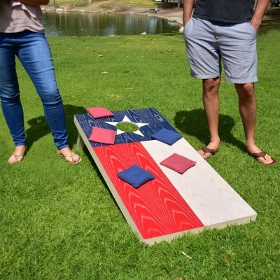 Our GoSports regulation size Texas state flag solid wood cornhole set is built using all wood materials to provide the ultimate cornhole experience. The boards are handcrafted from 100% wood as they do not include any composite materials or plastics. The 4 ft x 2 ft size is made to ACA regulations. The top surface is 1/2″ varnished cabinet-grade plywood (ACA regulation), that provides the perfect amount of slide. The frames are handcrafted from solid Pine, featuring mitered corner joints which are far superior to the shoddy construction of the ‘homemade style’ sets that simply have 2x4s sloppily nailed together. The wooden legs are retractable and are held in place by robust 3/8″ galvanized steel bolts with wing nuts. One of the greatest features of the GoSports set is we were able to engineer the weight of each set down to a manageable 38 pounds for the 4 ft x 2 ft without sacrificing gameplay. Compare that to the traditional ‘homemade style’ sets that weigh in at a backbreaking 60+ pounds! this weight savings means you will actually want to bring your cornhole game with you where ever you go. The set includes 8 regulation size all-weather cornhole bags which measure 6″ x 6″ and weigh 1 pound each and a robust carrying case. The bean bags are filled with recycled plastic pellets, but unlike corn, they will not Rot if they get wet.