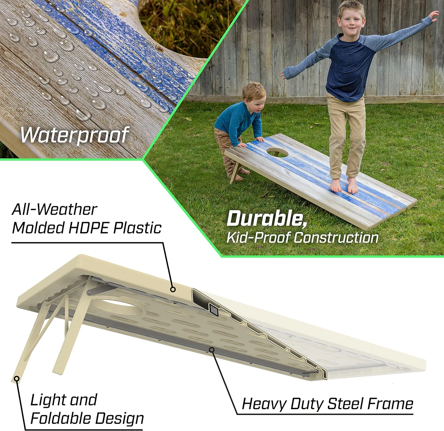 - DURABLE CONSTRUCTION: Features a sturdy, powder coated steel frame and made from ultra durable, kid-proof plastic for family playtime and more; Boards resists warping and peeling for worry-free play on damp lawns