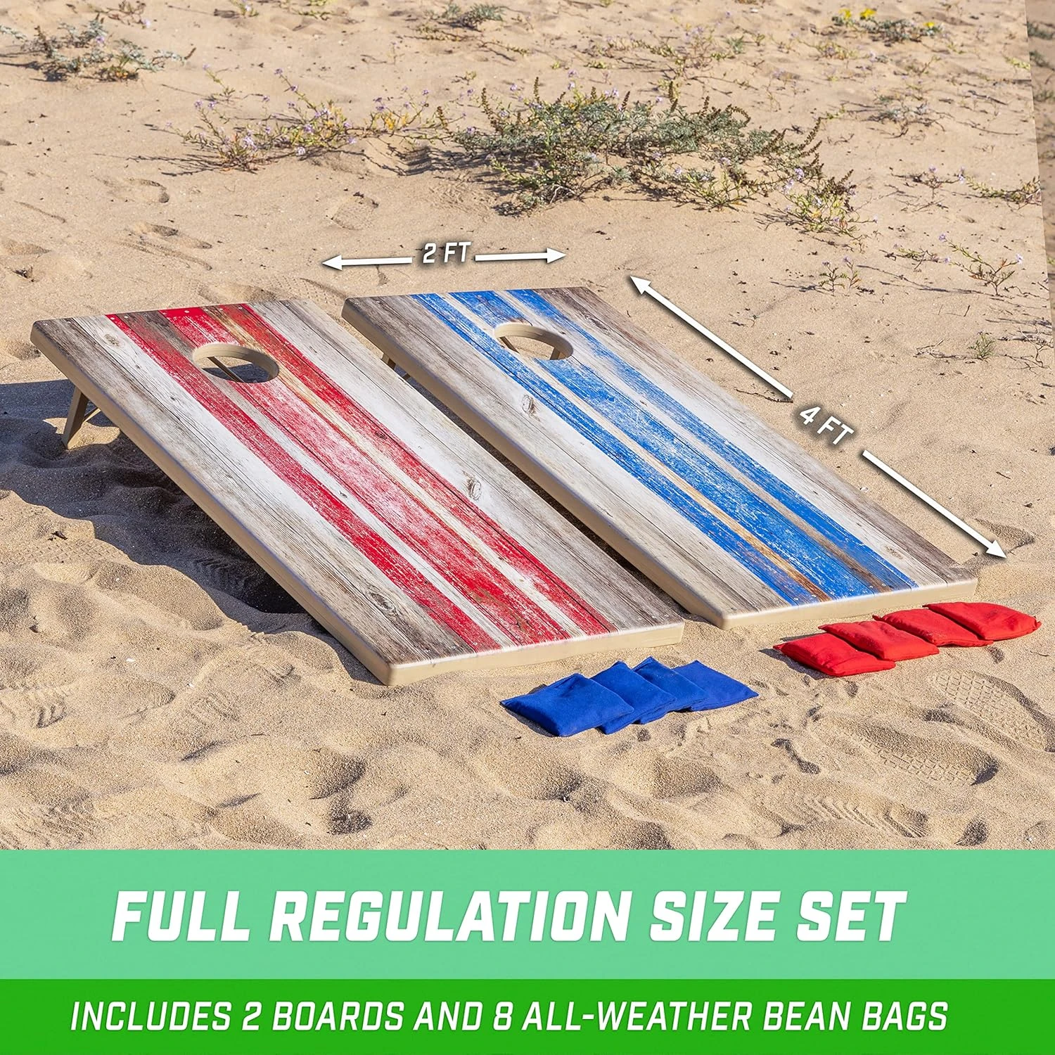 - REGULATION SIZE: Full set includes two weatherproof 4 ft x 2 ft cornhole boards and 8 regulation all-weather canvas bean bags with game rules for authentic gameplay