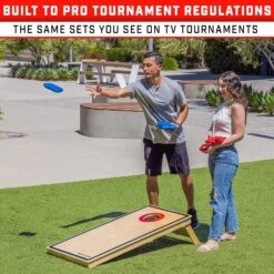 | Included Components | (2) 4’x2′ Tournament Cornhole Boards, (8) Regulation Bean Bags, Tote Bag |