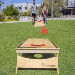 - TOURNAMENT EDITION: This premium tournament edition set includes two impeccably constructed solid wood cornhole boards with 8 dual sided bean bags (4 blue + 4 red) and tote bag